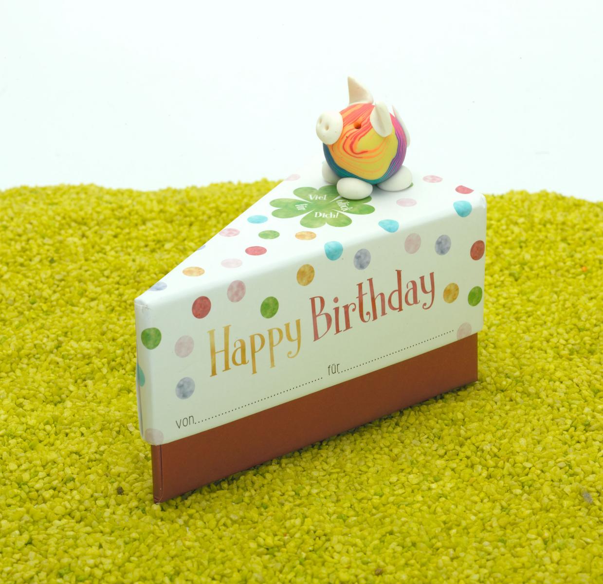 Geschenkschachtel Tortenstück mit Glücksschweinchen - Happy Birthday