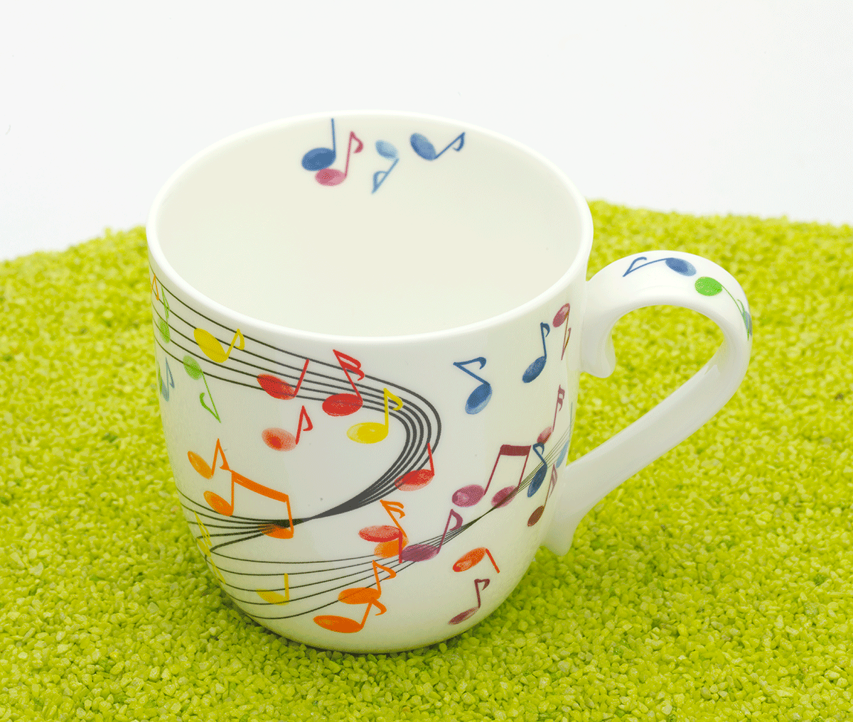 Diese Tasse ist mit bunten, tänzelnden Musiknoten verziert, die sowohl außen als auch innen sowie auf dem Henkel zu finden sind.